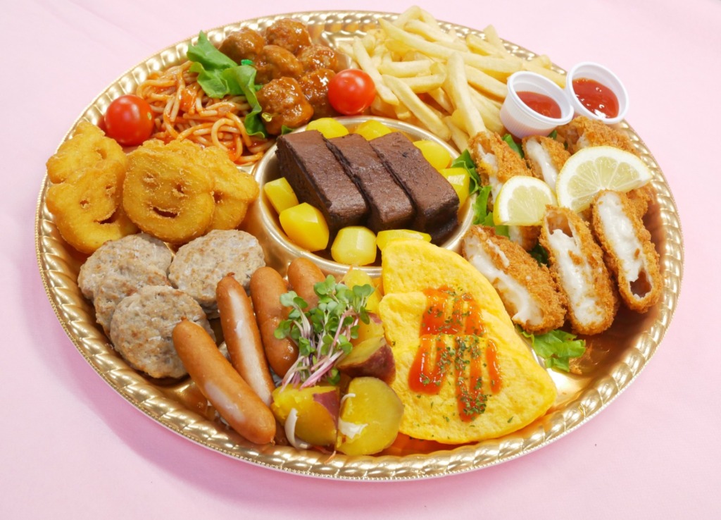 ハンバーグ・ミートボール・スパゲティー・ウインナー・ポテト・クマさんポテト・カニクリームコロッケ・トマト・さつまいもの甘煮・オムレツ・栗・チョコブラウニー